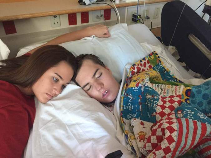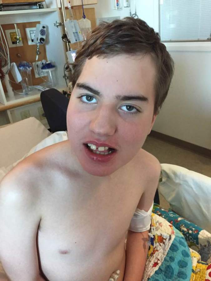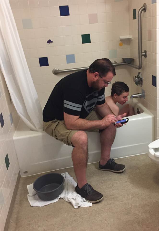 Ryan has been much more awake today, but he has also been more uncomfortable and irritable. I think some of that is because he is moving around more and keeps sitting up then lying down then sitting up then lying down. He is giving himself an abdominal work out which has to hurt. We can’t explain to him why he should just lay still, and he has his epidural which helps though. That will come out tomorrow, and he is also getting half strength formula with the hope that slowly getting him back onto his full feeds will help decrease any G.I. issues. Brad is officially home from school for a week before he heads to camp. He came right to the hospital when he left campus, and of course it was great to see him. Ryan was so cute because Brad and Trevor were the last visitors to leave the hospital today, and when Brad went to give Ryan a hug and say goodbye, Ryan grabbed onto his arm and kept saying no. It was absolutely adorable, but also sad because it was obvious he has missed his brother. I love the connection he has with all three of his siblings. It is doubtful we will go home before Tuesday since Ryan still has the epidural plus he is not on his full tube feed schedule. And I would definitely rather stay an extra day to make sure everything is well before we take him home. We really planned on staying until Tuesday anyway. Here are a few pictures I have already posted on Facebook, but for those of you who only look at this site, you may enjoy them as well. The two at the top are from today, and that two at the bottom where he is in the bathtub and smiling are from Thursday before surgery. He definitely doesn’t have those big smiles right now. Thank you for your continued prayers. Please pray Ryan will be free from pain and that he will sleep well.